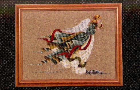 This Victorian Christmas angel flies over a village, scattering stars from the light of