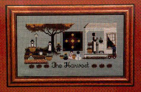 An amish family celebrates the autumn harvest, picking and canning fruits and vegetables. This design is based on a real amish family. Little Joey could be counted on to sneak a pinch of pie. Canning is done on an outside porch and children play as they work.